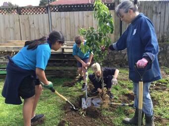 Today we planted a LEMON TREE very kindly donated by a school family.The children all got stuck in and dug a big hole and had a great time transferring all the worms ( there were plenty) to the raised vegetable beds.Unfortunately we struck the Mt Albert rock not too far from the surface, so the children dug out as much as they could then we planted the lemon tree with good top soil mixed with compost and sheep pellets. We made a big mound around the tree trunk giving plenty of good soil for the roots to grow and spread.Then the children watered the tree and pruned a few straggly branches to shape the tree nicely.It’s a been a big trauma for the tree at the start of this growing season, but we are optimistic it will thrive in it’s new location.