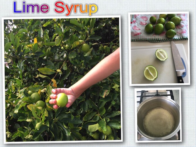 We harvested some limes from our lime tree and made a Lime Syrup, which is lovely diluted with water to make cordial, or to heat and drizzle over a dessert, such as Feijoa cake or Fruit Crumble.
